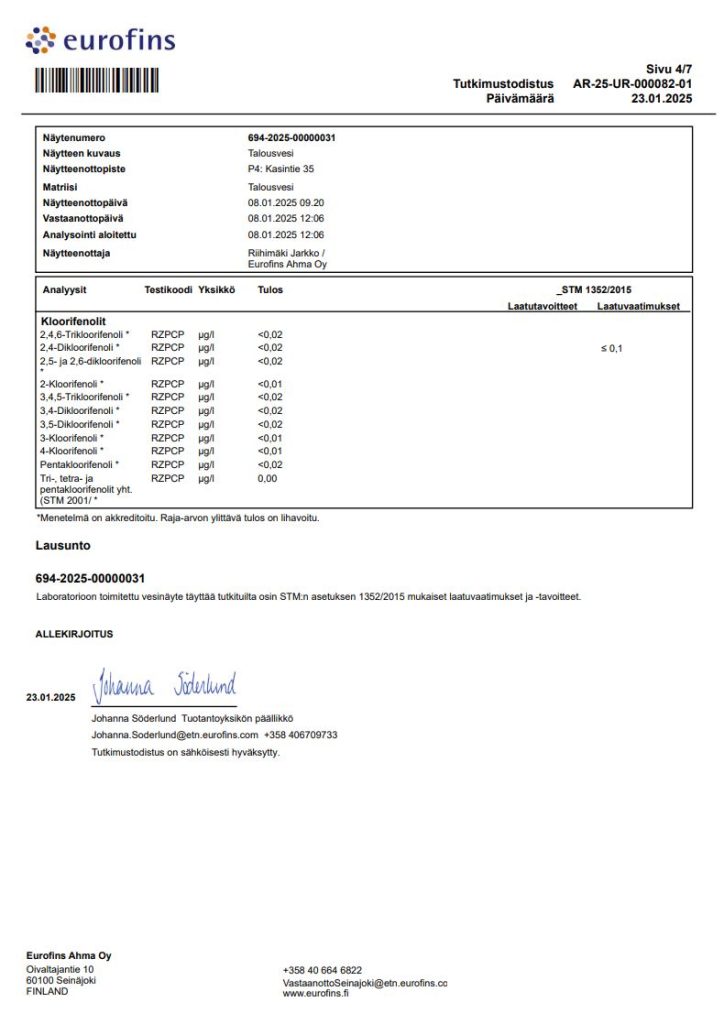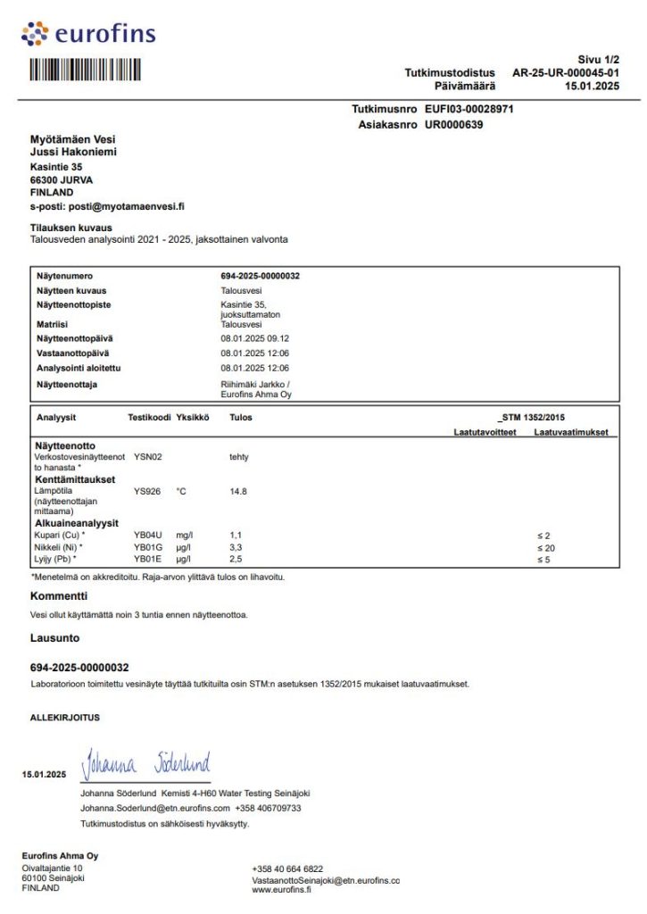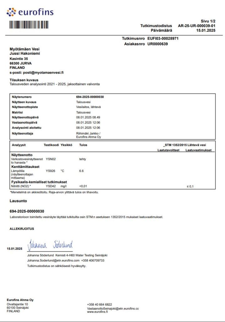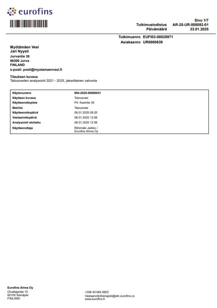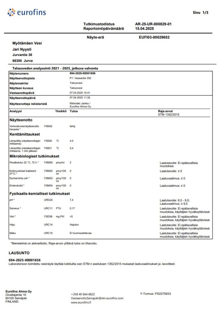 Eurofins Ahma Oy huolehtii Myötämäen Vesi Oy:n näytteenotosta.
