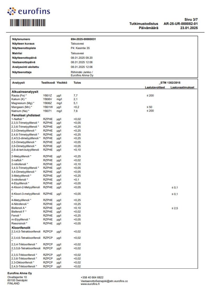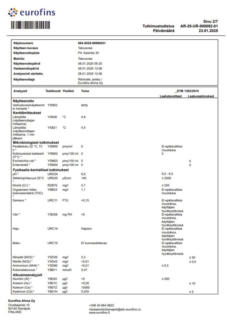 Kokonaiskovuus mmol/l 0,52 °dH 2,9 menetelmä: SFS 3003:1987 / ILM